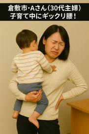 倉敷市在住のAさん(30代女性・主婦)は、子育てと家事で忙しい毎日を送っています。ある日、子どもを右側に抱っこしようとした瞬間、「ズキッ!」と腰に激痛が走り、その場で動けなくなりました。